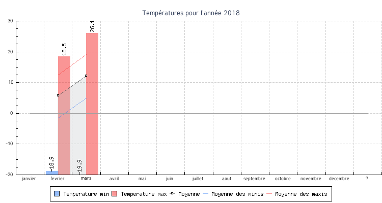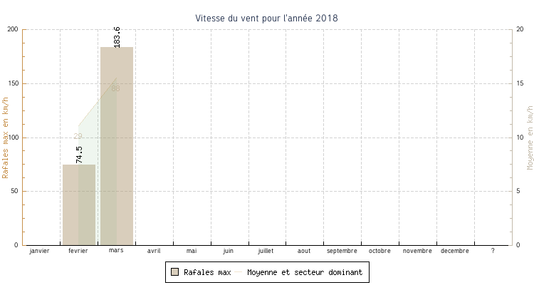 | fevrier | -18.9 °C | -1.5 °C | 18.5 °C | 12.5 °C | 5.8 °C | 11.1 km/h | 74.5 km/h | 29 |
